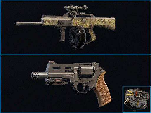 3. ACS12 with 2.0x Scope, Angled Grip, and Laser + Keratos .357 with Muzzle Brake and Laser + Barbed Wire