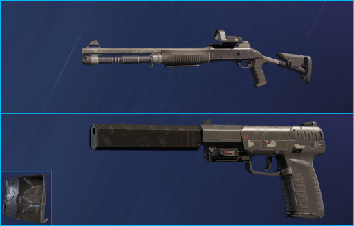 5. M1014 with Reflex B + 5.7 USG with Suppressor and Laser + Deployable Shield