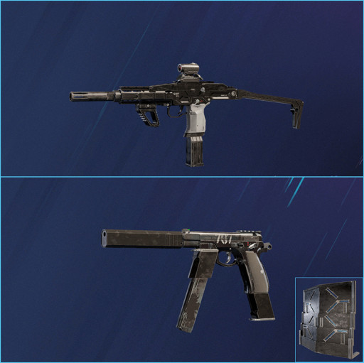 2. UZK50GI with Red Dot, Compensator, and Angled Grip + C75 Auto with Suppressor + Deployable Shield