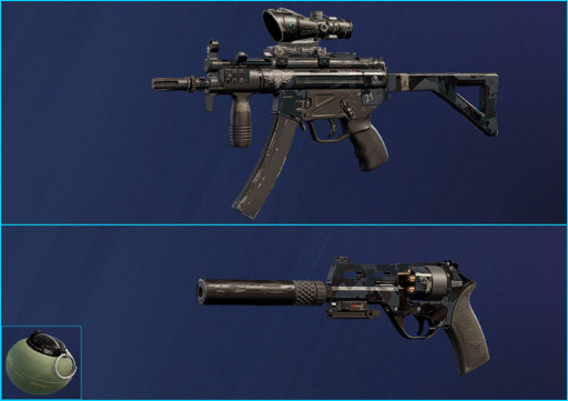 1. MP5K with Magnified B scope and Suppressor + Keratos .357 with Muzzle Brake and Laser + Impact Grenade