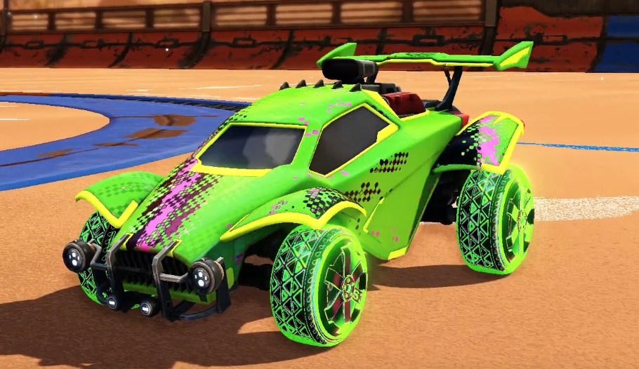 Its rims present a nice black to lime finish. The rims are pretty standard, but the way that green line animation moves around the outer edges of the rims really makes it stand out from the competition. A Dinosaur skin-like animation also circles around the tires. Pair this with the Shield Glitch decal for a perfect design.