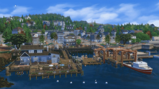 From the Cats and Dogs expansion pack, Brindleton Bay is a peaceful, lovely and charming world. There are multiple things to do and explore. Whiskerman’s Wharf is beautiful. There is a 64x64 lot, and multiple lots with different sizes. You can live near the bay, in the forest or in the countryside.