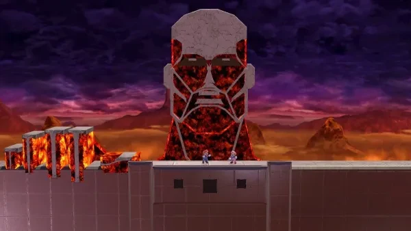 The stage puts players inside a Tetris board as some tetrominoes float above. Players who attempt to escape are hurt by the flame tiles and sent back inside. A fun stage but can drag out matches. It’s all for casual play.