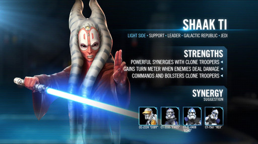 Led by the famous Shaak Ti, this Clone Trooper team centers around assisted attacks, counter-attacks, Turn Meter gains, and damage increases. Shaak Ti acts as a supercharger to the clones, enhancing their abilities tremendously.