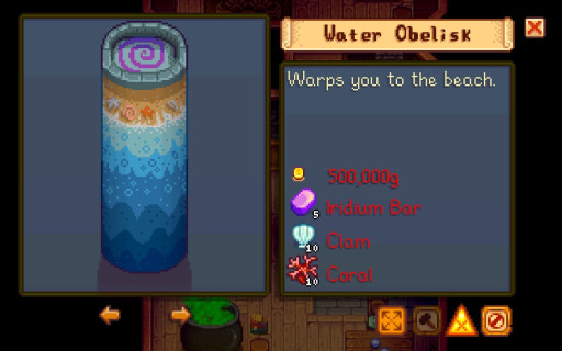 In place of the craftable Beach Warp Totem, interacting with the obelisk takes the player to the warp totem position on the beach. This helps you get to Elliot’s Cabin, the Beach, and Willy’s Fish Shop faster. You can't interact with it while on a horse.