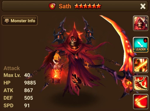 Sath is an irreplaceable unit with skills that you can’t find in any other monster. He was useless for a few years until he was given a major boost which completely changed the mechanics of the game. With his passive, he is able to double the damage output of all ‘Continuous Damage’ effects. He doesn't particularly shine in Arena but he is a must-have in almost all of your Dungeon runs. You can also build him without attack and focus on his HP and Accuracy stats.