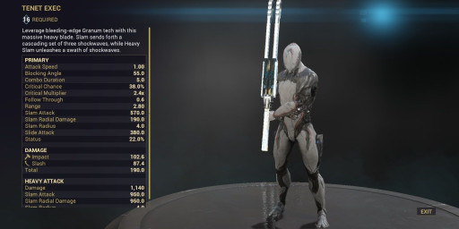 The Tenet Exec is a Heavy Blade melee weapon, requiring a mastery rank of 16 to wield. It may not be the fastest melee weapon, but it hits hard.