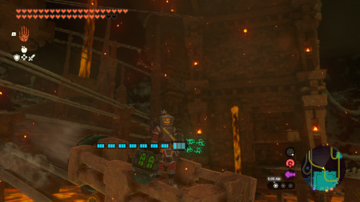 The dungeon challenges your ability to use ultrahand walking over lava by activating a fire hydrant to cool down lava, making a cobblestone-like platform. Making many platforms with that can make a bridge, incline, or decline. You need to make some inclines for Yunobo to crush marbled rock. The lava makes the dungeon daring even though the interactivity could be repetitive or dull.