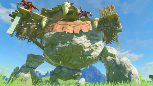 The first thing to remember when taking down a Battle Talus, is that it-just like its predecessor-has a weak spot: the ore deposit on its back. Strike this with an arrow, and the Talus will be stunned and fall over. Now this is the point at which I instinctively tried to climb the monster. DON’T, DO IT. You’ll never get past those wooden platforms. The trick is to get close enough while it’s stunned to use Link’s new Ascend ability! This will give you relatively free reign to smash that ore deposit to bits! Once it falls, it will drop a Talus Heart in addition to all those pretty gems. You can’t pick it up, but you CAN fuse it to a weapon; giving it a ridiculously high damage output increase.