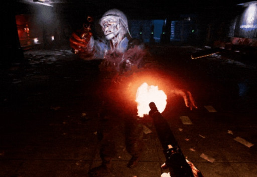 The player aims at two red-eyed zombies as they get ready to attack the survivor. I don’t blame them for being angry. It looks like someone gassed their standing area if you catch my drift.