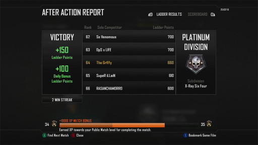 Welcome to league play. Check out this match report, it shows the player’s points, his division and respective sub division, his rank and even his win streak. League play was undoubtedly the best feature of BO2. You could finally play in a competitive game setting, in a 4v4 match up and get ranked for your performance.