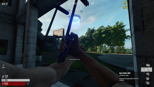 If you don't wanna risk losing that fight, just jam a syringe called “Muscle Milk” into your forearm, and boom! You now deal 15% extra damage for two minutes. I guess all those protein shakes paid off, technically speaking.