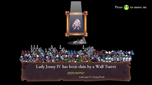 Still it will fill up a massive amount of time and is probably the equivalent to a carnival ride in terms of entertainment. That's a very strong 8/10 from me! It's not a true work of art, but Rogue Legacy will appeal to anyone for at least a good several hours, days, even weeks. When I give a rating this high, it means the game is definitely worth a try. You won't be sorry. If you are, feel free to bag on me in the comments (or if you enjoy it, praise is accepted too).
