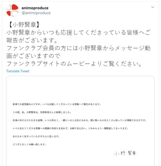 Two very prominent Japanese voice actors recently informed the rest of the world that they have wed! The new couple’s announcement went live simultaneously at 11 PM on July 7th, 2020. The original posts can be found here (Hanazawa) and here (Ono).